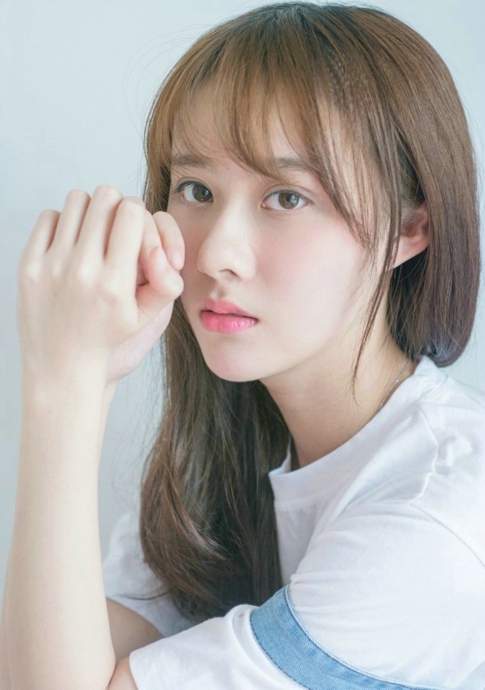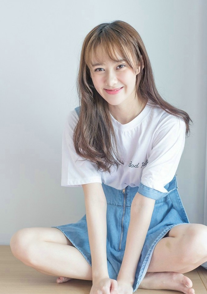 写真中的曹曦月,身着简约的白色T恤,搭配一条浅蓝色高腰背带牛仔短裙,整套装扮淡雅而充满青春气息。她或单手托腮,眼神灵动地凝视镜头;或低头不语,嘴角泛起一丝若有若无的浅笑,表情自然而甜美,仿佛夏日里一阵沁人心脾的微风。这种毫不造作的姿态,恰好展现了她作为新生代演员的纯粹与可塑性。