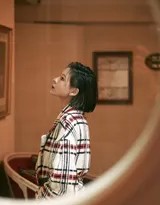 除了服装本身,张予曦对整体风格的把控也堪称到位。内搭选择了简约的纯色基础款,避免了对格纹主视觉的干扰。妆容清新淡雅,以近乎素颜的裸妆强调肌肤的通透感,唇色也是自然的豆沙色系,与整体慵懒清爽的调性高度统一。发型则随意披散,或任由微风拂起几缕发丝,增添了几分灵动与生活气息,全然没有刻意摆拍的僵硬感。
