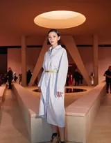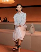 这组大片最令人印象深刻的,莫过于张予曦整体造型风格的“减法”哲学。与过往那些强调曲线、奢华或繁复细节的礼服造型不同,这组照片中的她选择了解构经典的衬衫式长裙。挺括的衬衫领口保留了职业装的利落与精神,而延伸至裙摆的流畅线条则柔和了整体的轮廓,在刚柔之间取得了精妙的平衡。